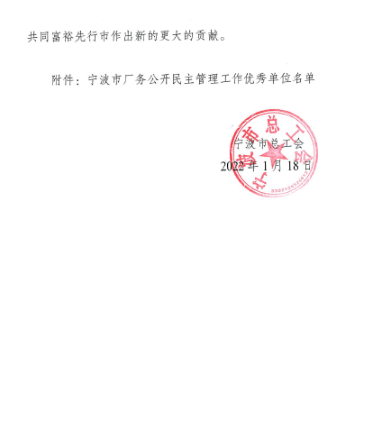 近日,廣博集團(tuán)股份有限公司被市總工會授予市級廠務(wù)公開民主管理工作優(yōu)秀單位稱號,這是我們堅(jiān)持職工代表大會制度,促進(jìn)和諧勞動關(guān)系,推進(jìn)企業(yè)工會員工共同進(jìn)步的實(shí)踐成果。