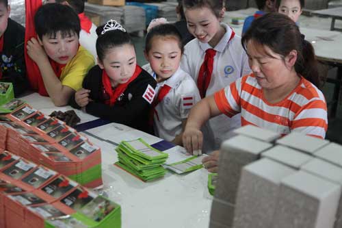 孩子們還和一線工人阿姨們一起裱紙,做筆記本,并在勞動現(xiàn)場為生產(chǎn)在工作一線的工人叔叔阿姨們送上了自編自演的精彩節(jié)目,送上節(jié)日的問候,隨著這一批小精靈的到來,車間里到處洋溢著輕松歡樂的氣氛。