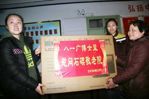 Later, players each carried two cartons of milk, sent each one to the hands of the old carefully, and wished them healthy. Seeing these well-behaved women basketball players, the old smiled from ear to ear, full of warm atmosphere. At last, women basketball players presented New Year's gift to the old, that was, 32-inch LCD television.