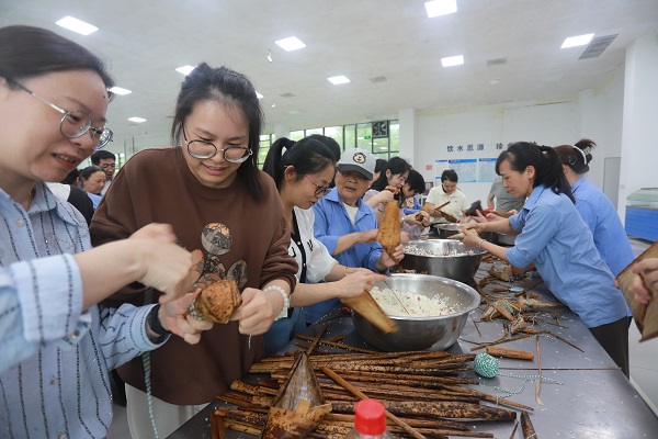 活動開始后,現(xiàn)場瞬間變得熱鬧非凡。大家紛紛拿起粽葉和餡料,開始了自己的創(chuàng)作。有的員工手法熟練,包出的粽子形狀規(guī)整、美觀大方;有的員工則顯得有些手忙腳亂,但臉上的笑容卻格外燦爛。集團公司黨委副書記舒躍平也加入其中,和員工邊一起交流心得,現(xiàn)場氣氛十分融洽。