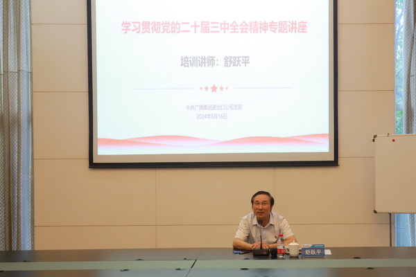 8月16日在廣博集團(tuán)的多功能廳,黨委副書記舒躍平圍繞“深入學(xué)習(xí)貫徹黨的二十屆三中全會(huì)精神”為黨員們上了一堂生動(dòng)而深刻的黨課。